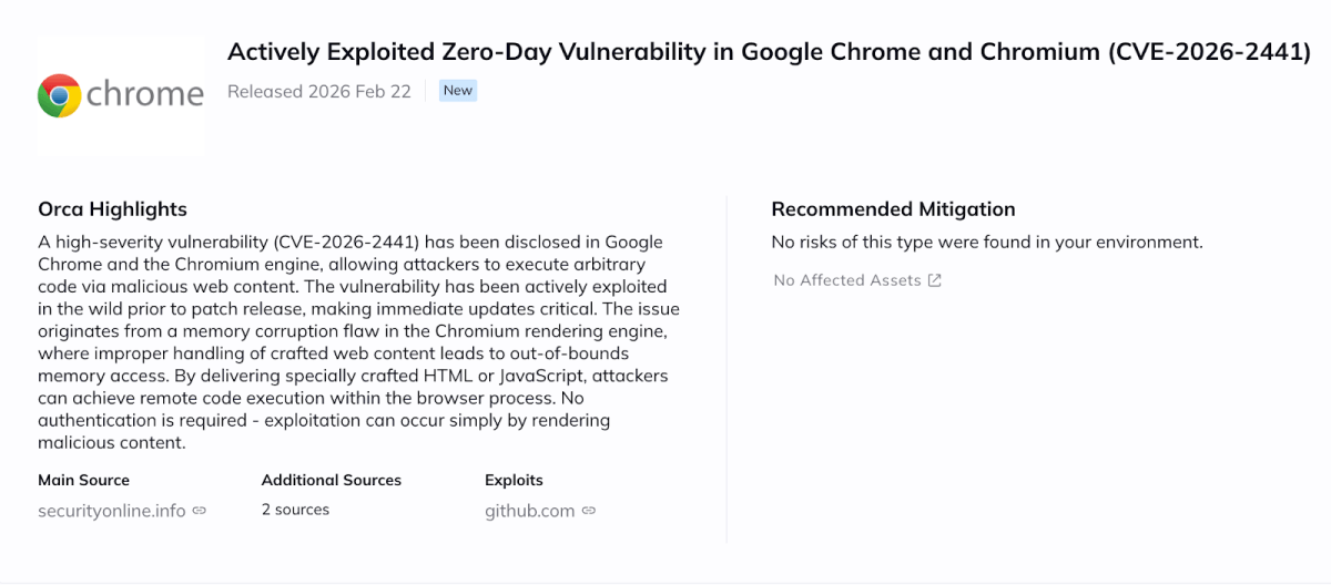 Orca enables customers to quickly identify assets running vulnerable Chromium or Chrome versions, including headless deployments inside containers and CI/CD workloads. Orca provides context on internet exposure, runtime reachability, and asset criticality, helping teams prioritize remediation based on real risk rather than CVSS alone. Affected assets are highlighted directly in the newItem view to streamline response and patch validation.